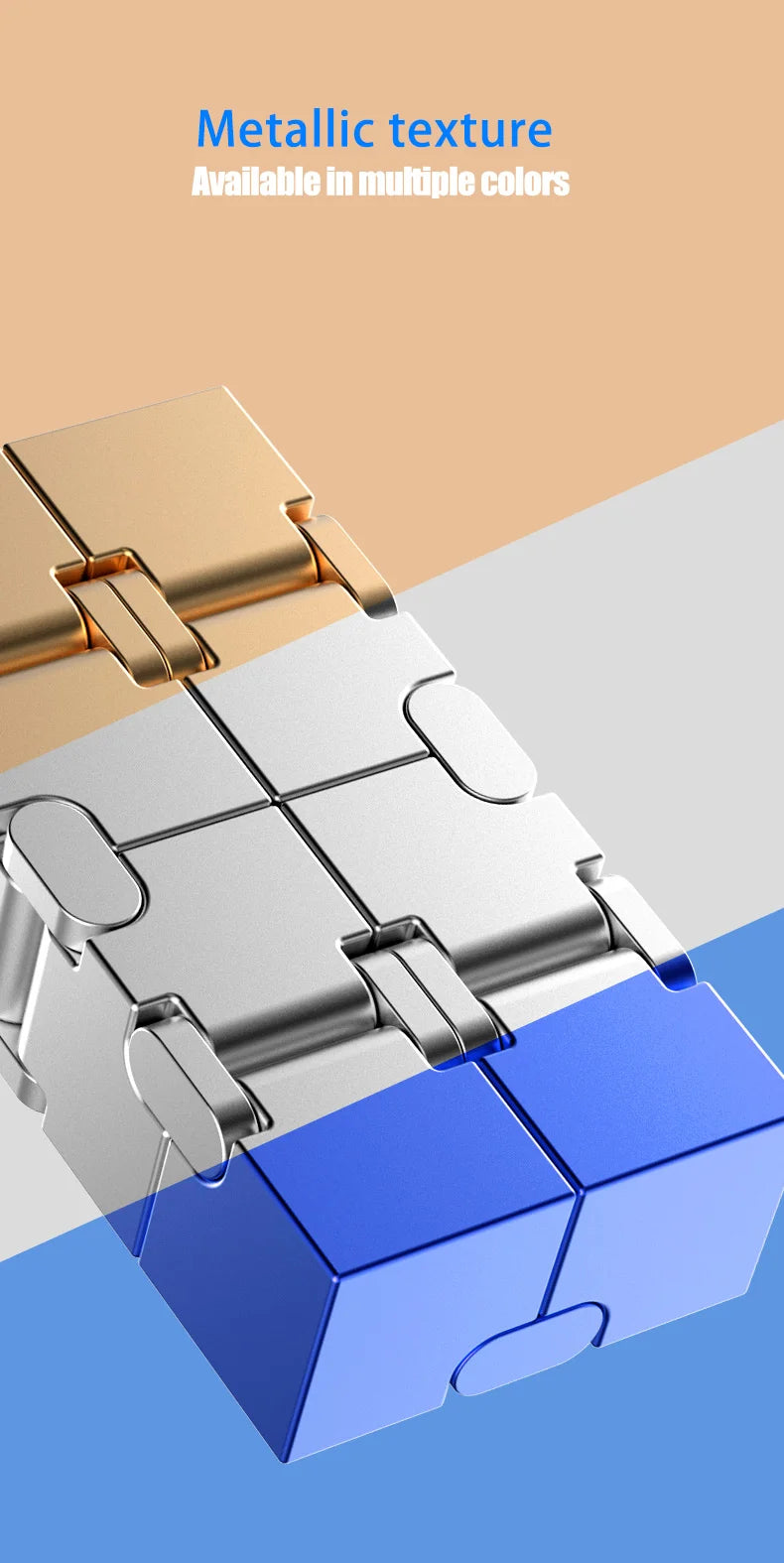A compact folding cube crafted from durable metal components and designed for smooth, continuous motion. The Infinity Magic Cube flips and folds effortlessly in all directions, creating a calming tactile experience that helps reduce stress and improve focus throughout the day.